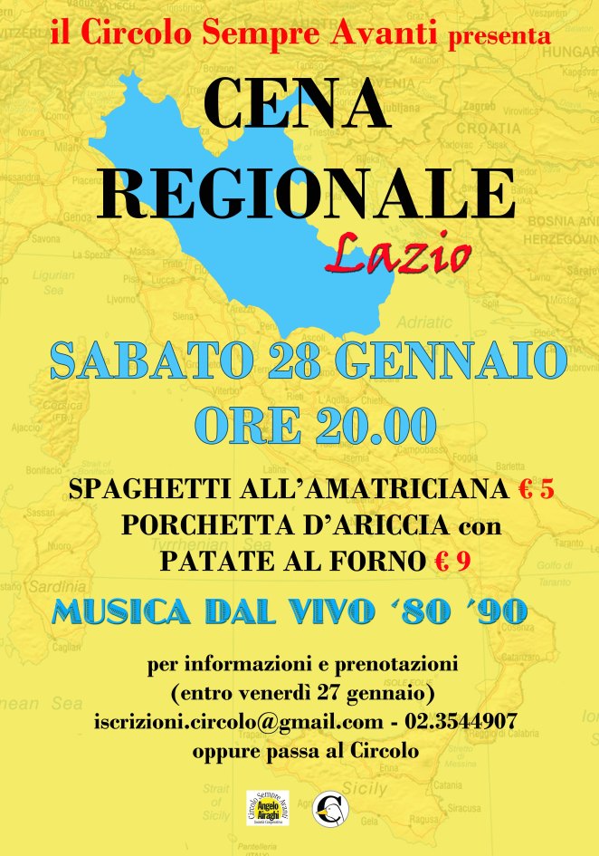 Cena Regionale Lazio Anche quest’anno il Circolo organizza le cene popolari a tematica regionale! Ecco qui la prima cena dedicata al Lazio Condividi: Fai clic per condividere su X (Si apre in una nuova finestra) X Fai clic per condividere su Facebook (Si apre in una nuova finestra) Facebook Mi piace Caricamento... Correlati