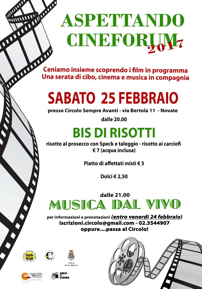 Bis di risotti :risotto al prosecco con speck e taleggio e risotto ai carciofi, dolci, buon vino e divertimento assicurato, ma soprattutto la presentazione dei film della nuova edizione del cineforum