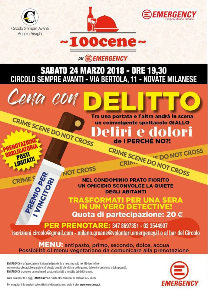 Cena per Emergency 24 marzo Prenotatevi alla Cena per Emergency Divertente Cena con delitto! Vi aspettiamo Condividi: Fai clic per condividere su X (Si apre in una nuova finestra) X Fai clic per condividere su Facebook (Si apre in una nuova finestra) Facebook Mi piace Caricamento... Correlati