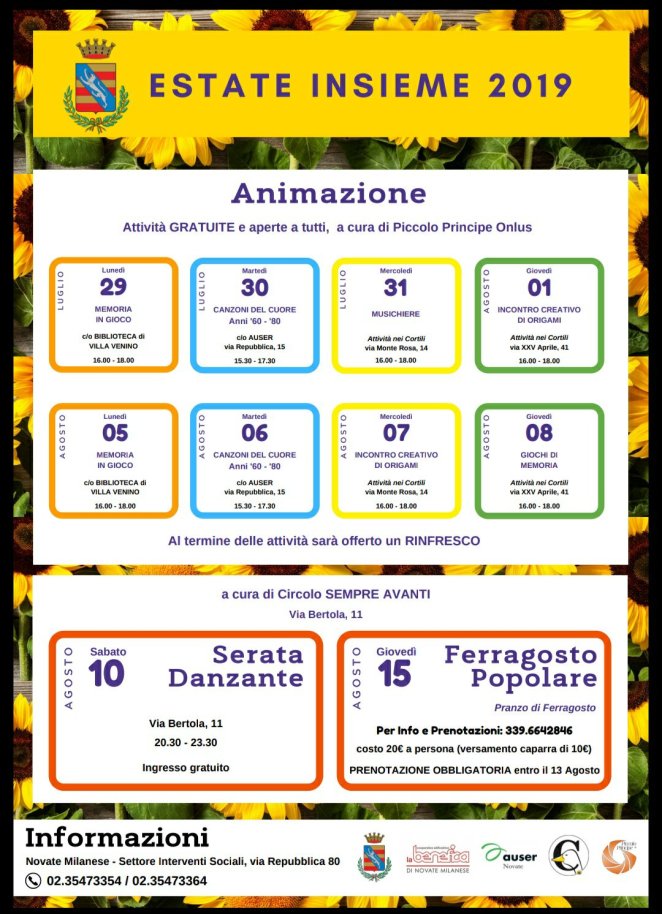 Estate insieme anche questo 2019 un sacco di iniziative organizzate dal comune di Novate Milanese in collaborazione con il Circolo, la Cooperativa la Benefica e altri enti del territorio.