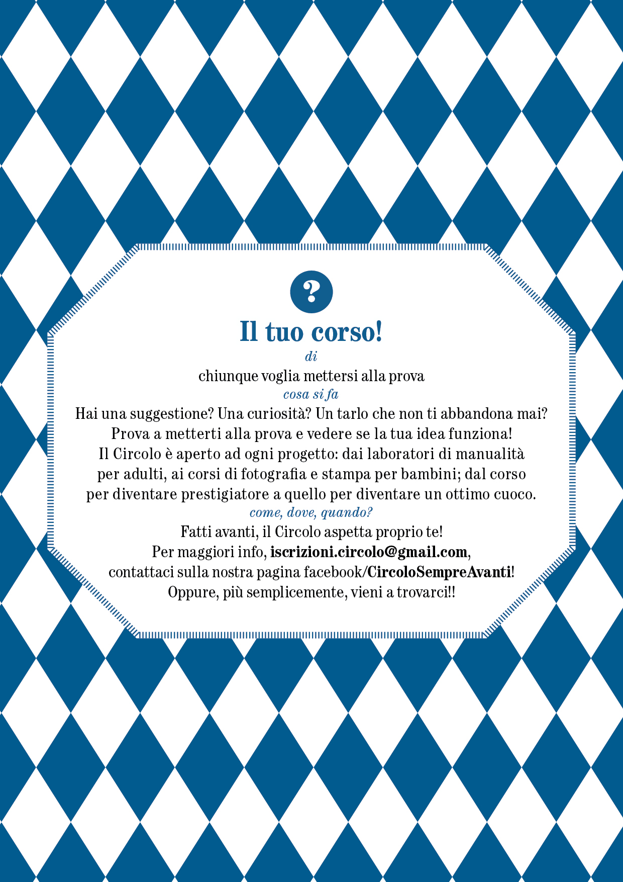 – Il Circolo collabora a titolo gratuito nella promozione del corso attraverso la sua pagina facebook/CircoloSempreAvanti, il sito in