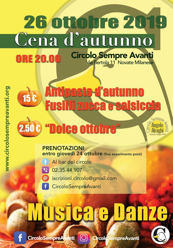 Il 26 ottobre dalle 20.00 vi aspettiamo alla Cena d’autunno, cibo, musica e danza per una serata in compagnia!🎶 🍝 🕺