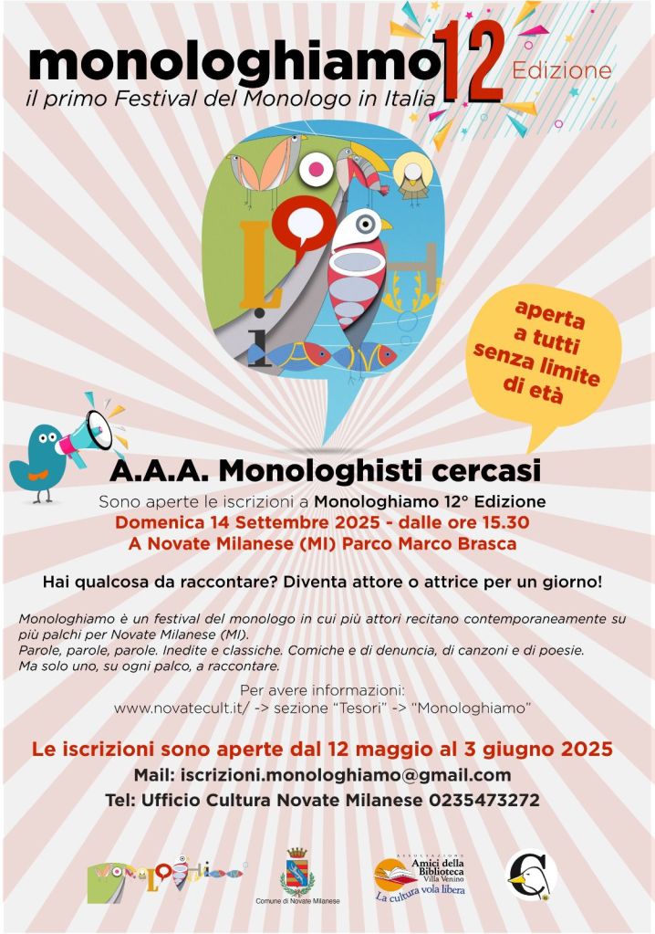 Fino al 3 giugno 2025 sono aperte le iscrizioni (senza limiti di età) alla 12esima edizione di Monologhiamo, il primo Festival del Monologo in Italia che si svolgerà a Novate Milanese il 14 settembre 2025.