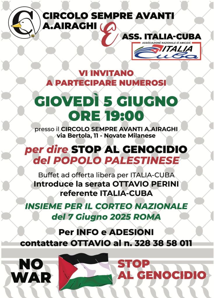 Domani giovedì 5 giugno alle 19.00 serata organizzata con l’associaziione Italia Cuba – Novate Milanese per dire STOP al genocidio del popolo palestinese🇵🇸