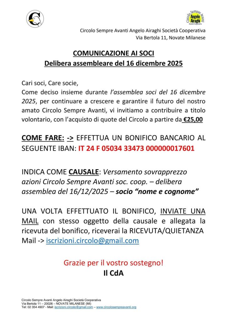 Come deciso insieme durante l’assemblea soci del 16 dicembre 2025, per continuare a crescere e garantire il futuro del nostro amato Circolo Sempre Avanti, vi invitiamo a contribuire a titolo volontario, con l’acquisto di quote del Circolo a partire da €25,00